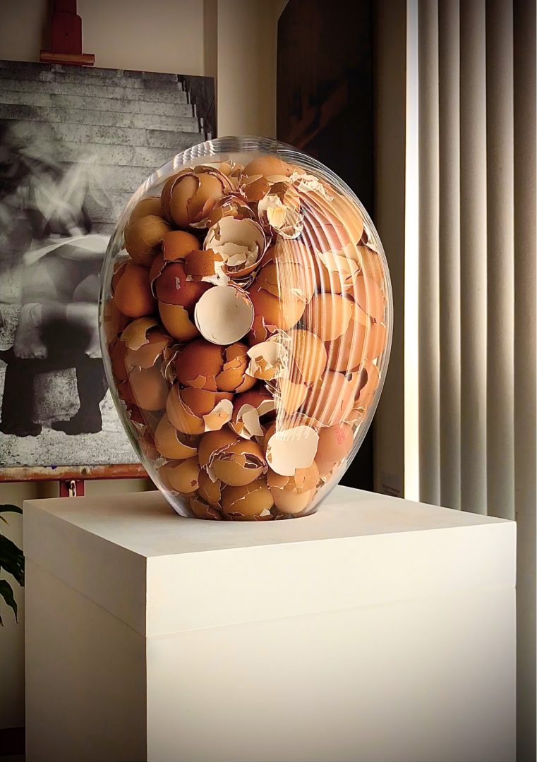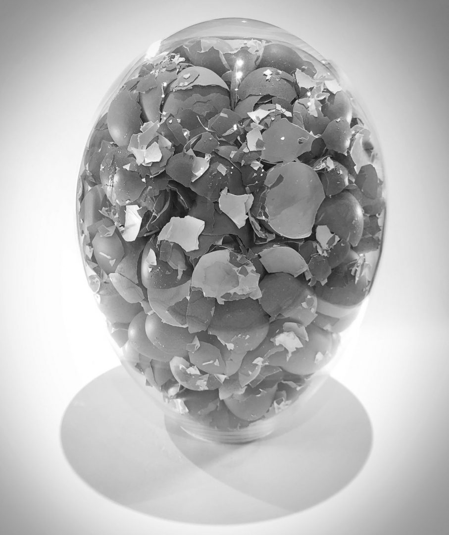 This artwork aims at challenging our perceptions of boundaries in order to encapsulate the essence of paradox. The egg becomes entangled in a self-referential loop as its own shells become its essence, its core. The transparent glass may symbolise the transparent nature of paradox (a bodyless identity), as it reveals the internal contradiction.